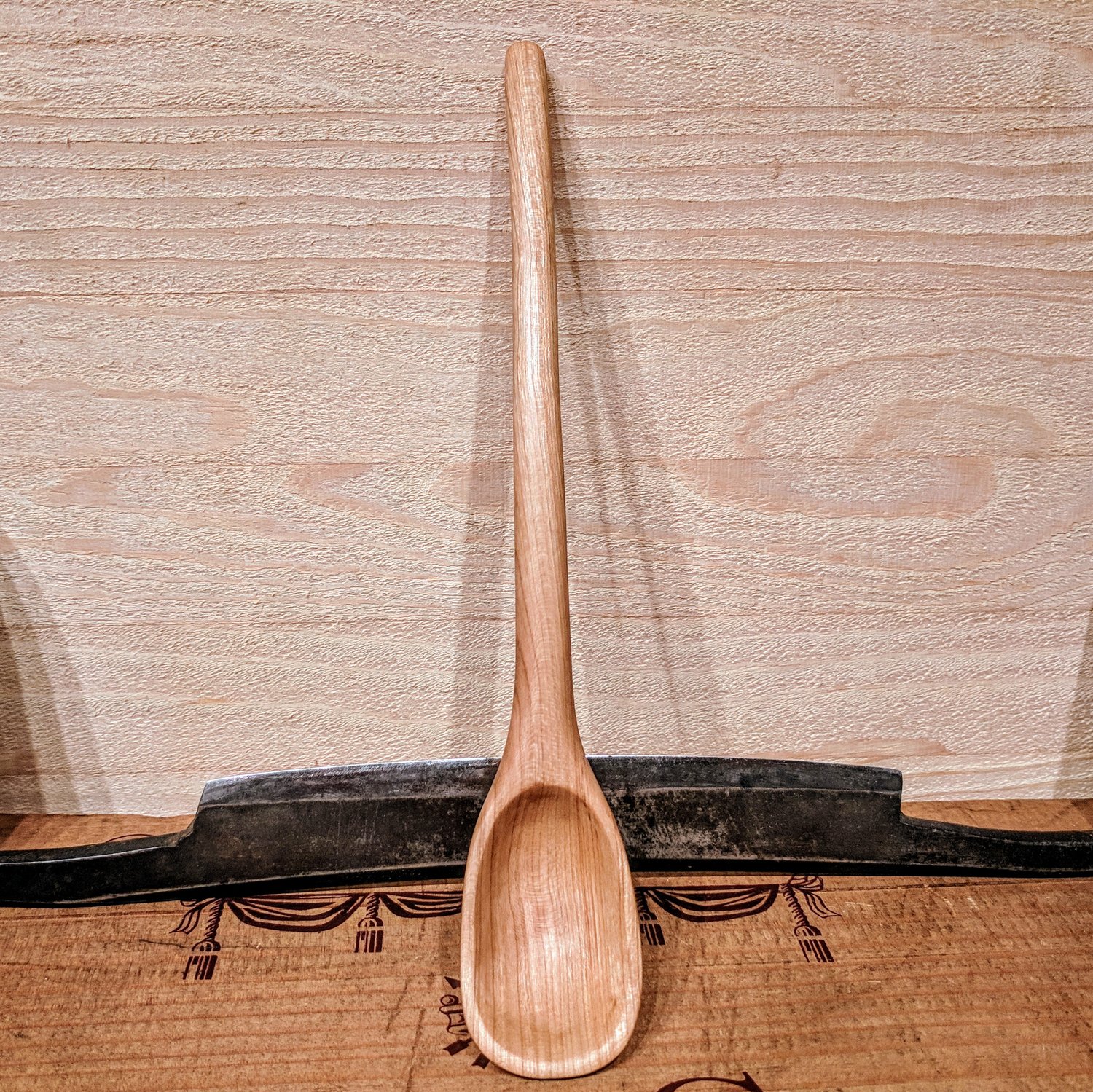 Longer handled scoop carved out of Cherry. It holds about 1 tsp. Finished with beeswax and flaxseed oil.