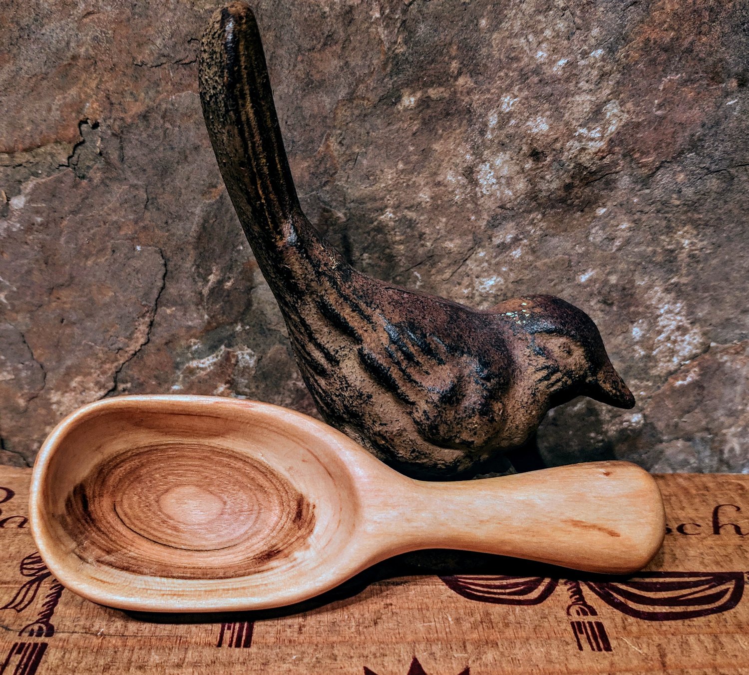 Scoop carved out of Cherry. This one has some wild sap patterns. Finished with beeswax and flaxseed oil.